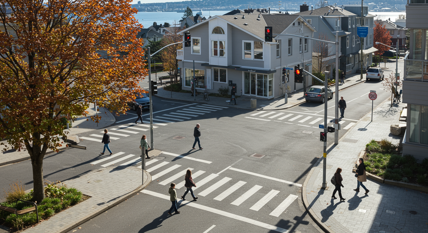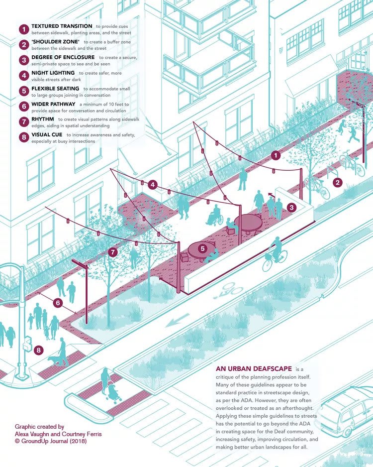 Alexa Vaughn’s DeafScape concept calls for streets with public seating, vegetation, bright lighting at night, tactile cues, and wide sidewalks.